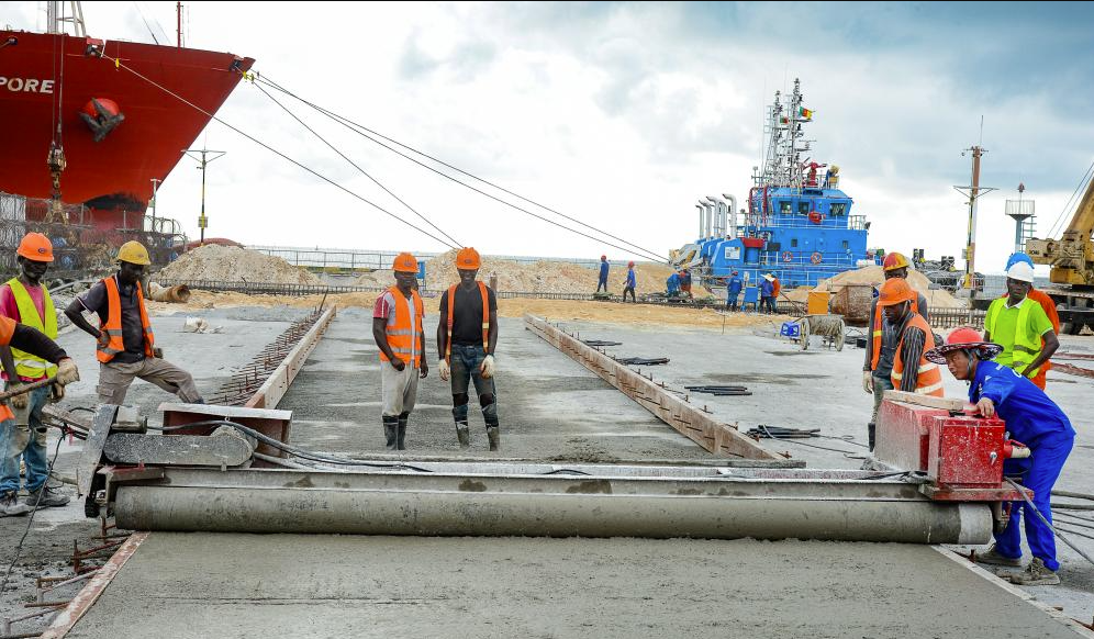 At Kribi Deepwater Port in Cameroon, a gantry crane over ten meters high is lifting cargo for a 10000 ton…