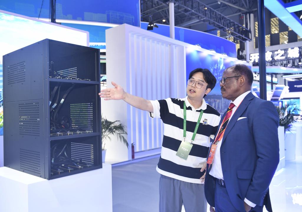 6月11日,參展商在向外賓介紹展出的高性能GPU服務器。 新華社記者劉坤攝